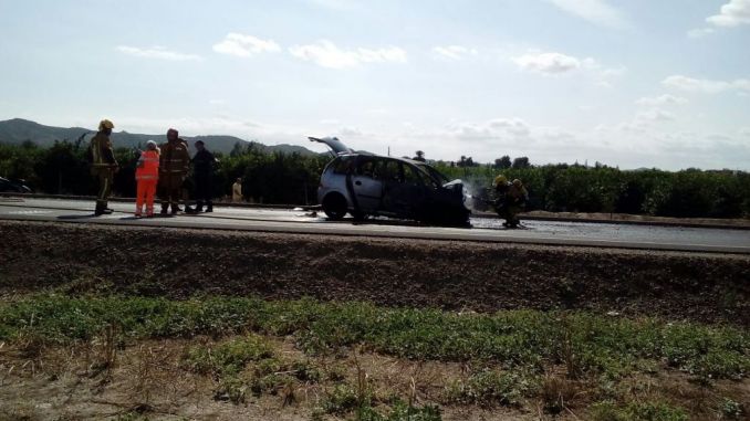Los bomberos sofocan las llamas en un coche tras un accidente en la CV-91 en Benejúzar