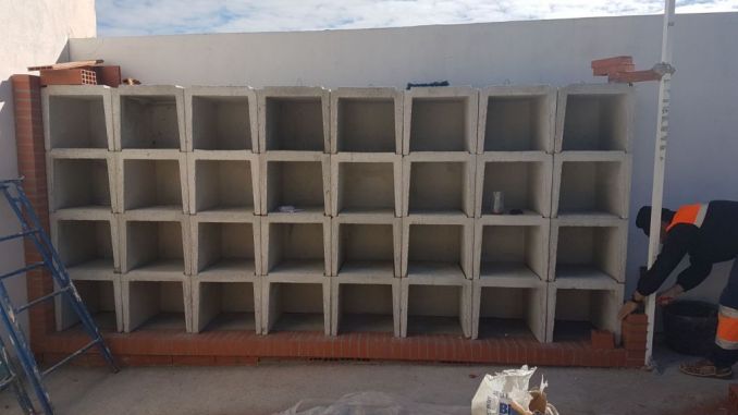 La concejalía de cementerios, dirigida por Miguel Gascón, está construyendo una nueva galería de 32 columbarios donde los vecinos de Almoradí podrán depositar las cenizas de sus seres queridos en el cementerio municipal.