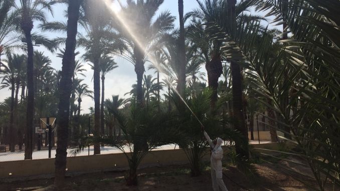 La Concejalía de Medio Ambiente, que dirige el concejal Miguel Ángel Fernández, dio a conocer este martes los trabajos de tratamiento químico foliar contra el picudo rojo en las palmeras ubicadas en el Palmeral de San Antón de Orihuela.